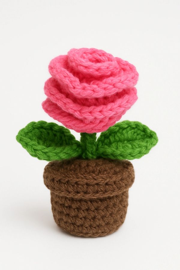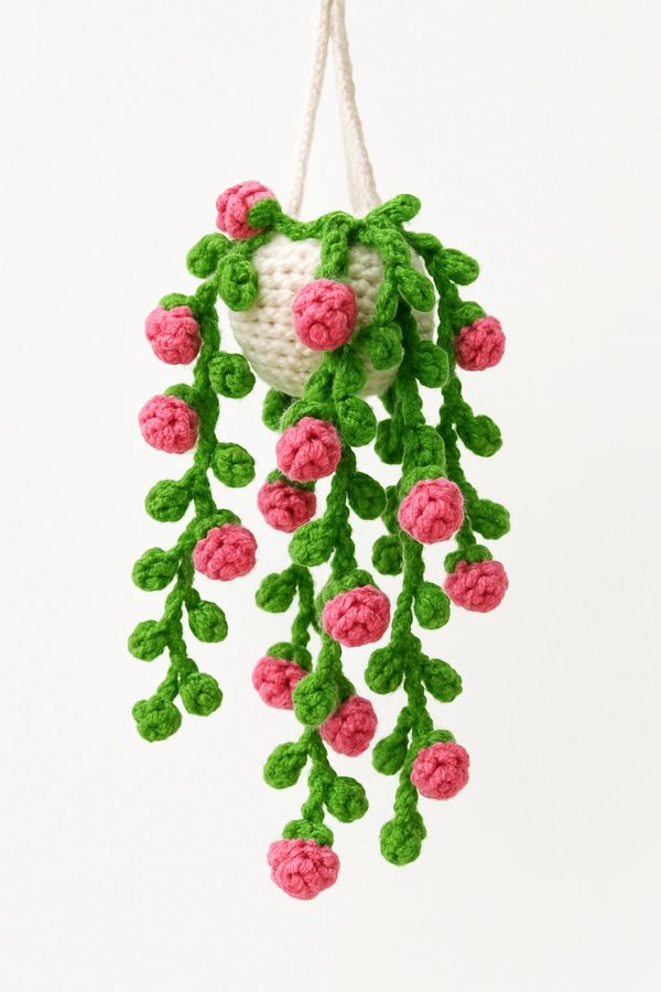 Crocheted Hanging Plant with Pink Flowers and Green Vines